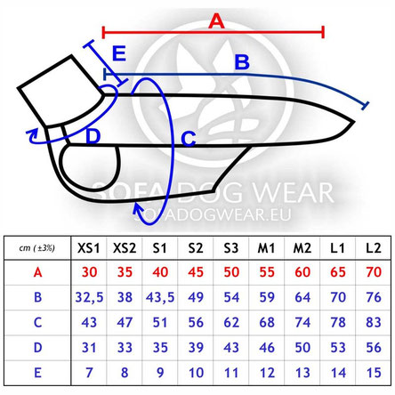 "B" bis "E" (BLAU) entsprechen und zeigen die tatsächlichen Maße des Mantels/Produkts (nicht denen des Hundes!!).